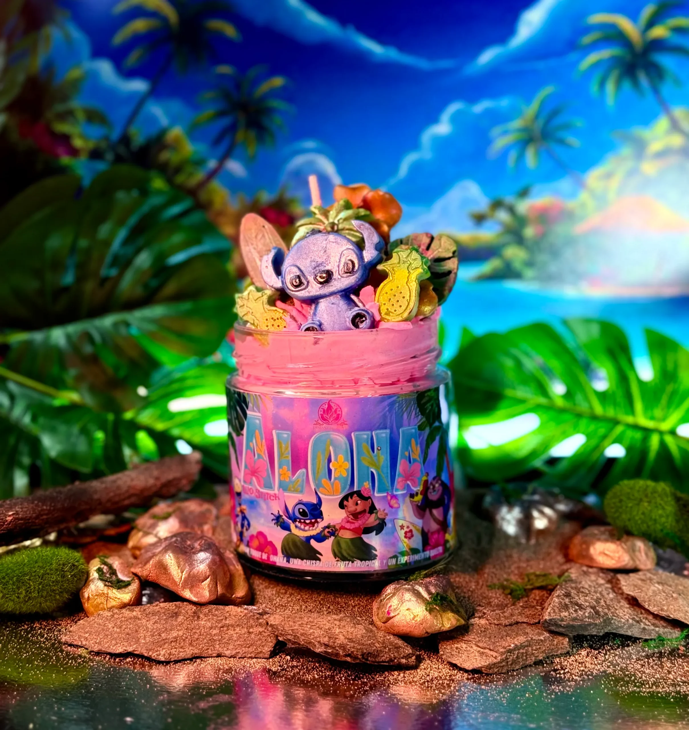 Aunque no lleve esa decoración superior, sí incluye melts decorativos inspirados en la historia, con elementos que mantienen toda la esencia de Aloha y Ohana, y ese aire tropical y acogedor que la hace tan especial.