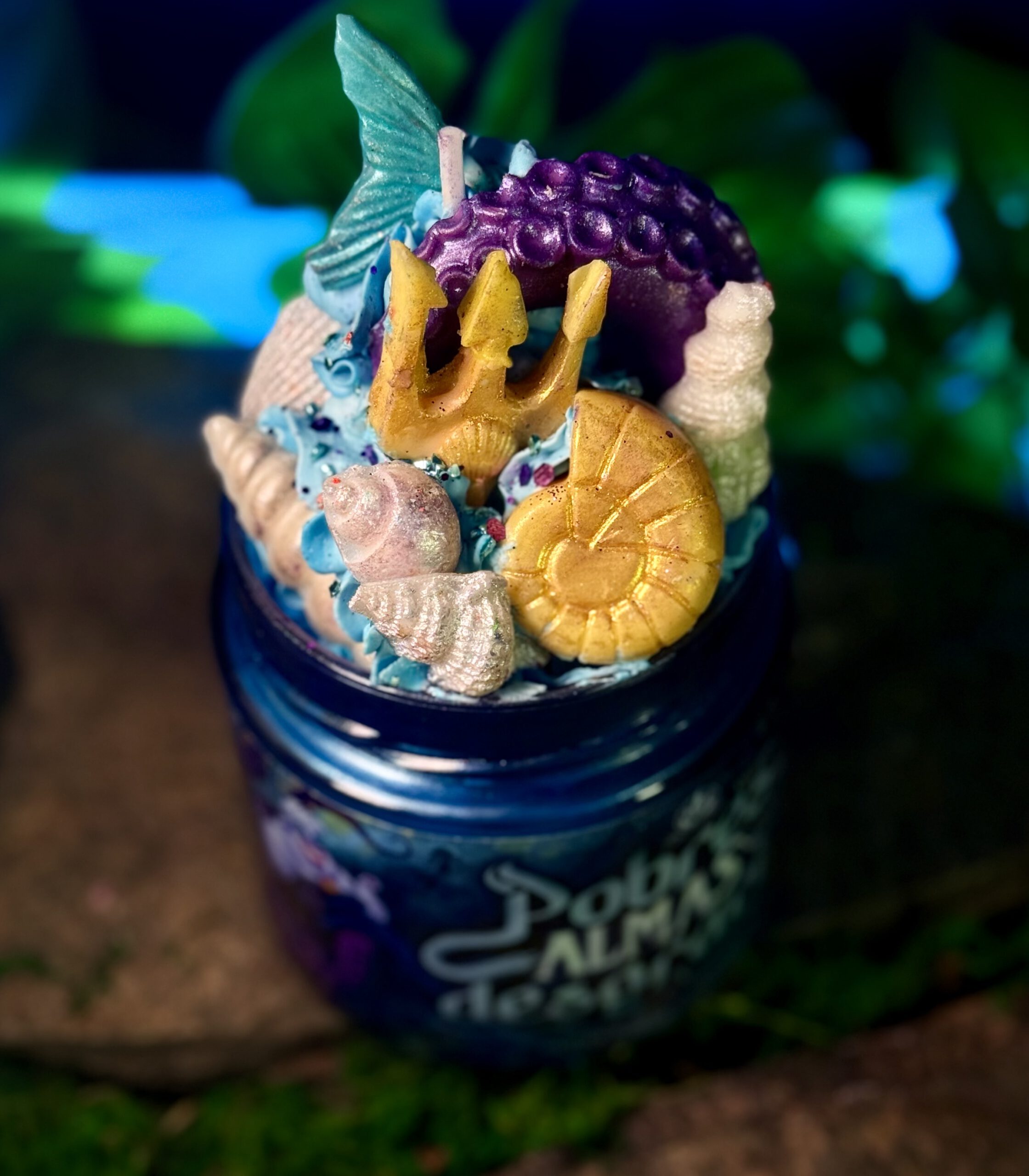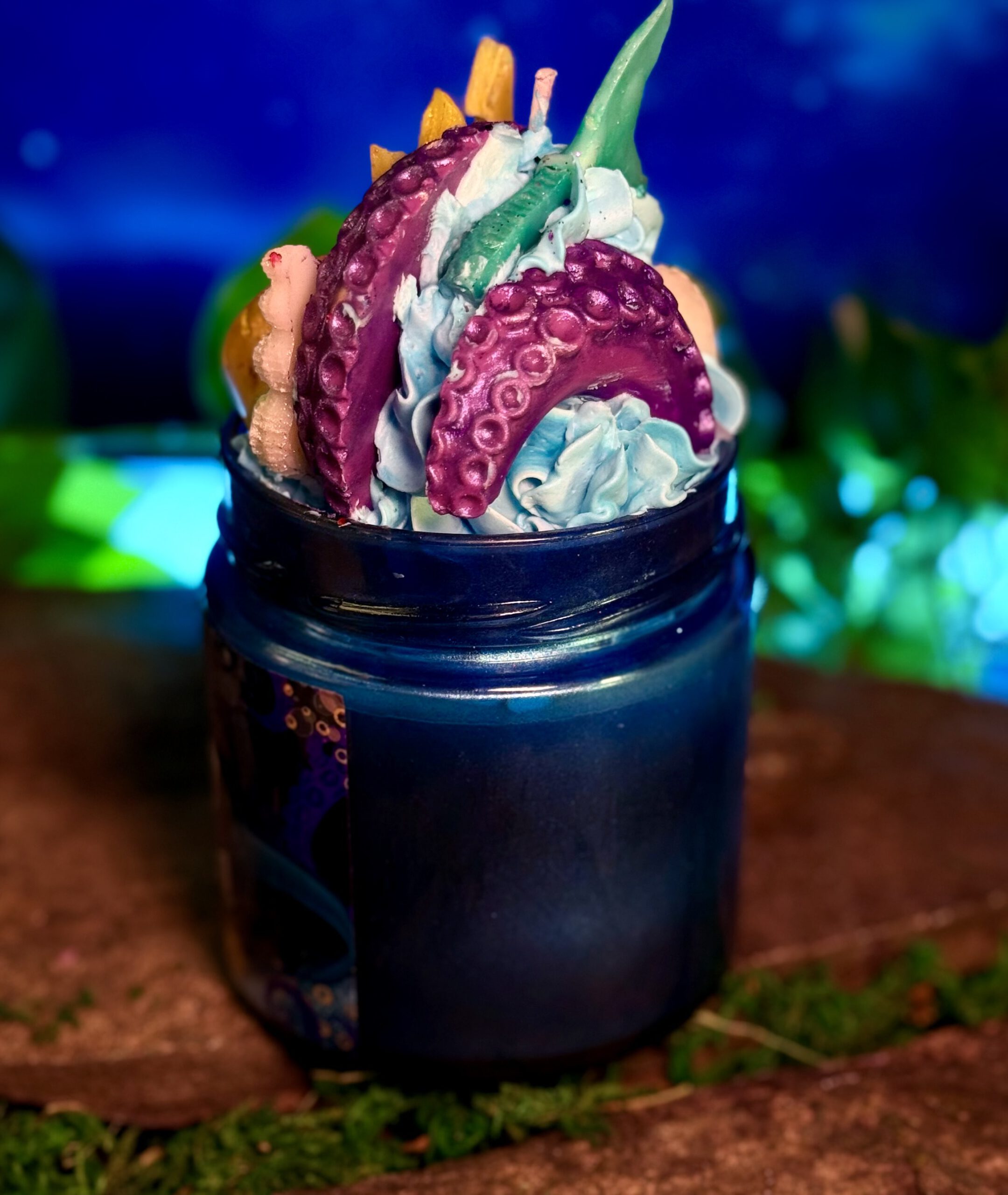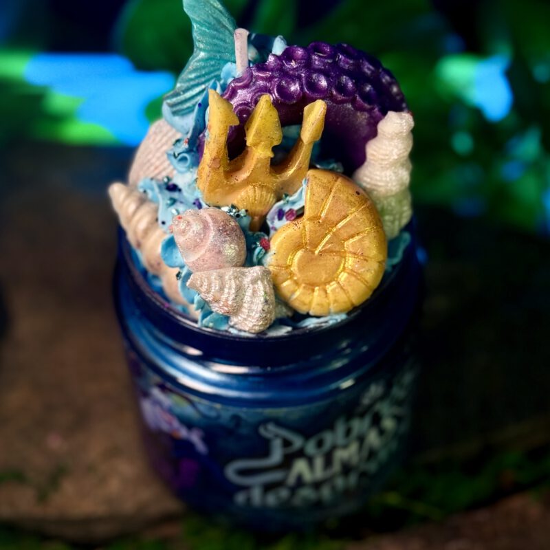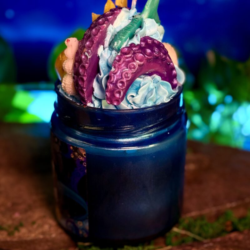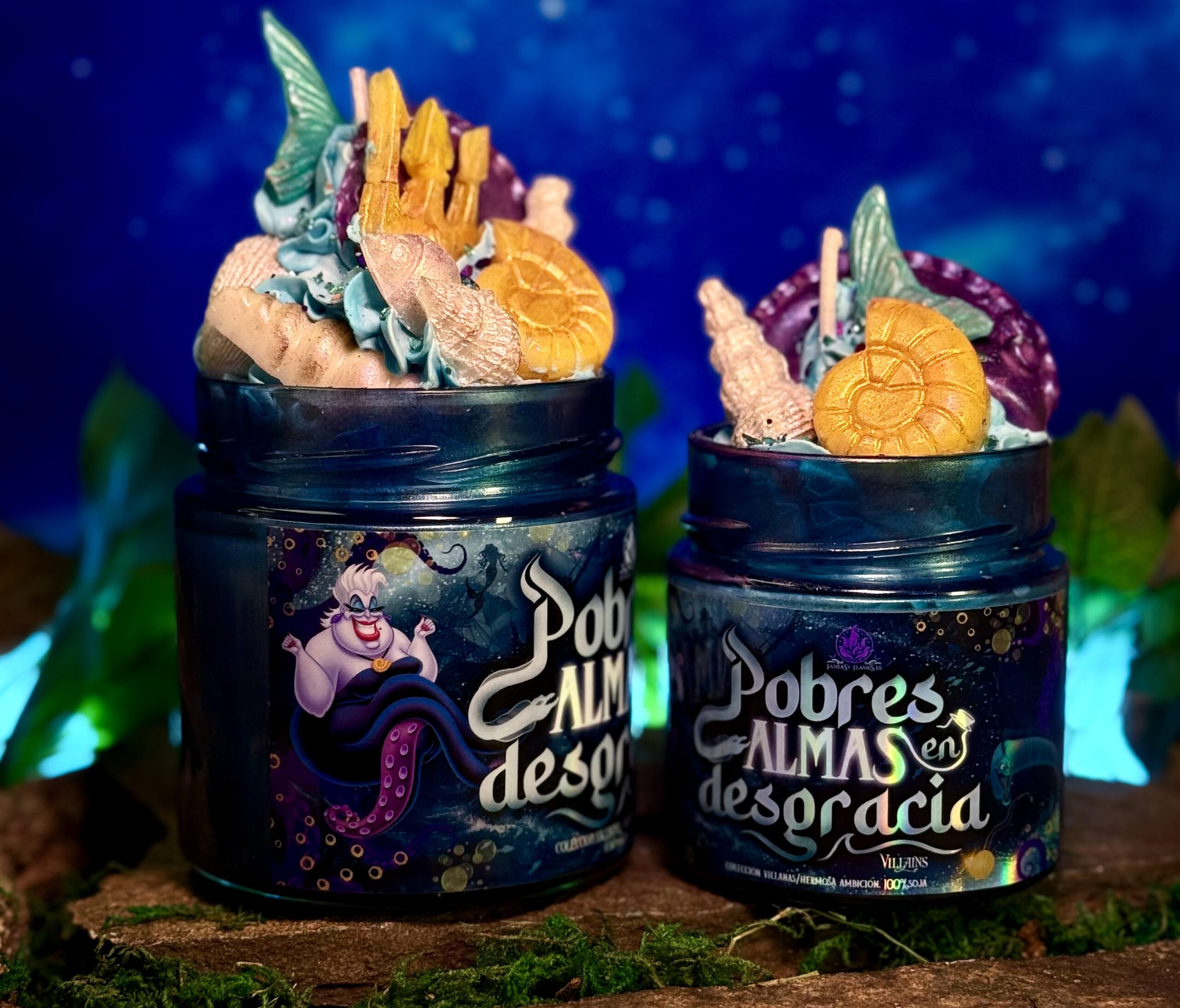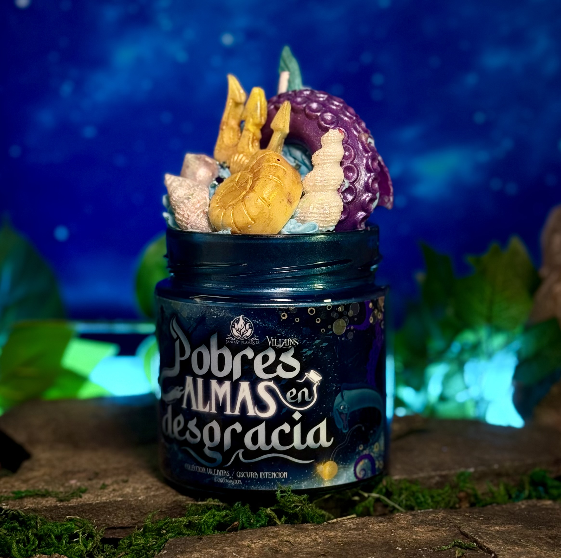 Úrsula, villana Úrsula, Disney, villanas Disney, inspirada en Úrsula, Sirenita, Úrsula Disney, Sirenita Disney, mar, oceánica, fondo marino, colección villanas, azul turquesa, edición limitada, cera azul, cuentos oscuros, literaria oceánica, literaria Disney, turquesa lila, bruja del mar, personajes Disney clásicos, sirena, aroma maracuyá, mango, naranja, frutal, tropical, dulce, marino, salado, exótico, fragancia marina, fragancia tropical, fragancia dulce con toque marino, Fantasy Flames